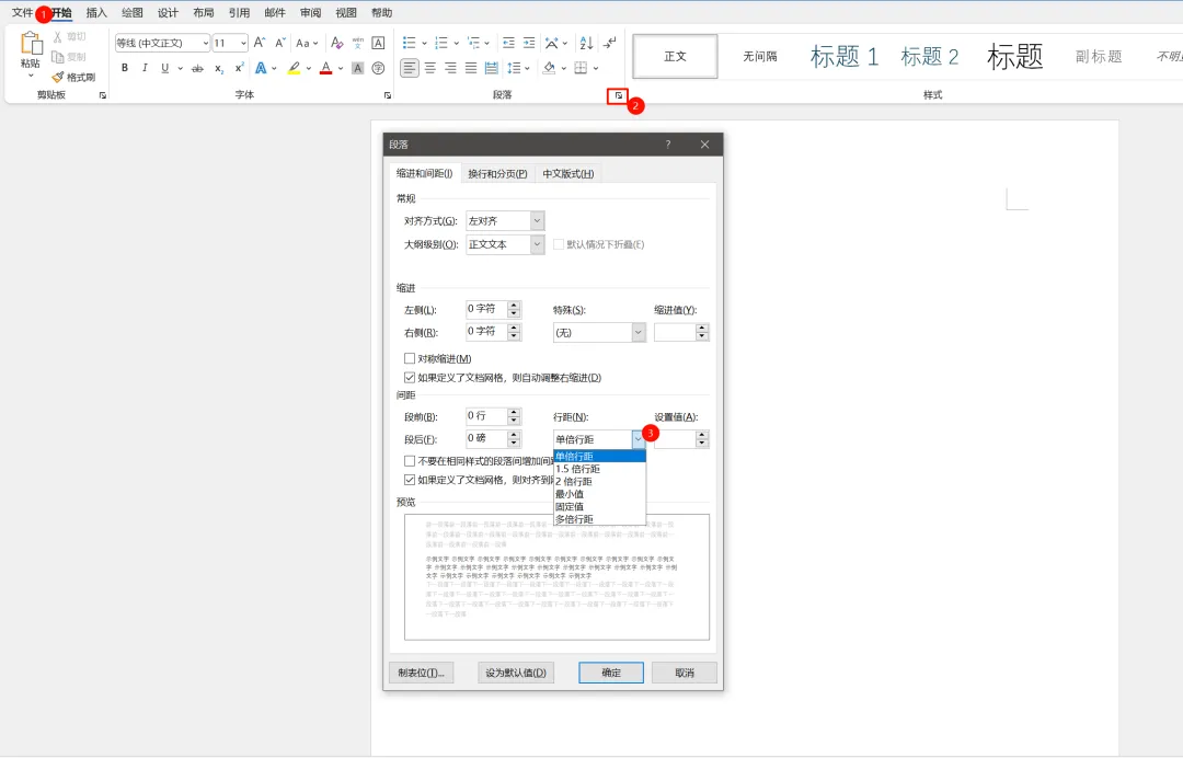 行距,顾名思义就是每行的间距,可以调整行与行质检的间距,最小为单倍距(倍数)、最小值(磅)。依次点击开始-段落的右下标会弹出对话框供选择,预设好的有单倍行距、1.5 倍行距、2倍行距、最小值、固定值、多倍行距。多倍行距看输入大于1以上的数字。