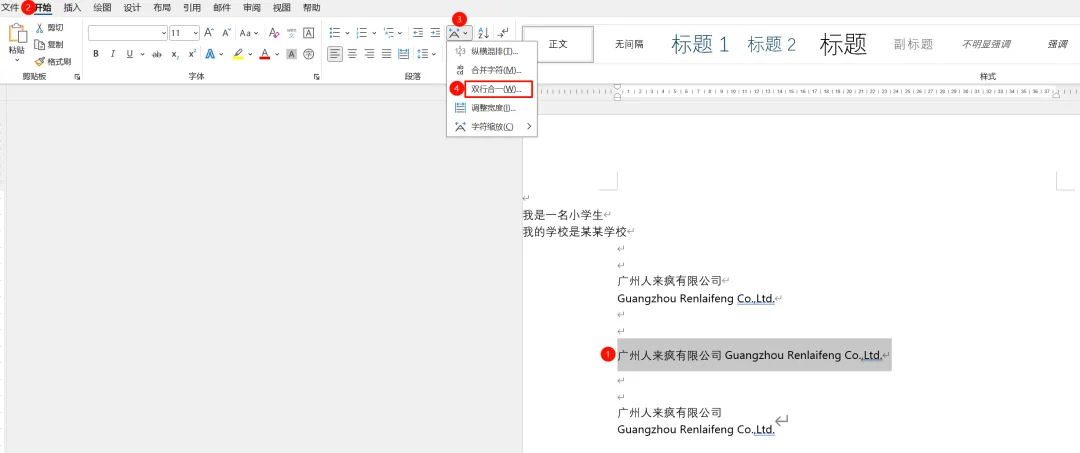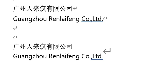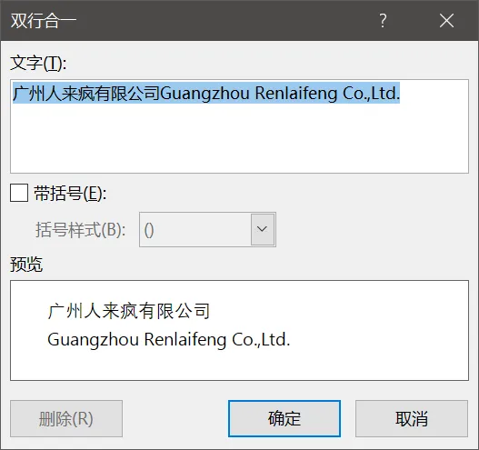 通过实际的使用发现,这个功能很适合在公司的中英文名称排版上,把两行当一行使用,但是这个功能有个缺点,就是不能使用段落相关的功能,如换行之类的。看下面的例子,上边为换行,下边为双行合一的对比: