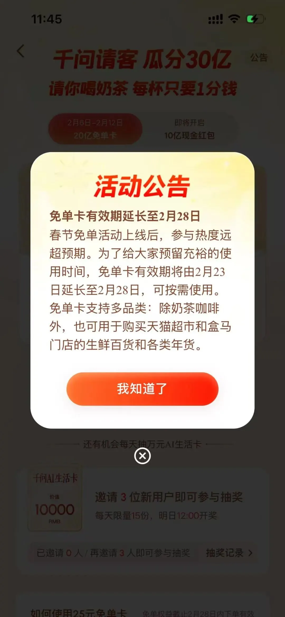 记得去领千问app的免单卡 “ 每个人都可以建造一个自己的数字花园 ” 春节红包大战已经打响,阿里发起猛攻。千问app砸30亿红包赤裸裸抢流量,各大媒体头条争相报道。今天上午我下载了千问app,也体验了一把薅羊毛,领了一张25元的免单卡。 据说昨天千问app服务器已经干崩溃了,下载和下单的人太多了。刚才我去下单,对话框依然显示人太多。免单卡有效期截至2月28日,大家还有很多时间,有空记得去领。 END 感谢你读到最后,帮我点个“赞”+“推荐”,并“分享”给更多人吧。 如果你觉得有启发,可以关注我。 关联阅读: 最期待的韩国恐怖片《僵尸校园2》就要来了 有些老人或长辈就是犟(过年不要对小孩做的一些事情) 唐家岭我有印象 蜜雪冰城小票上线连载小说,这事你怎么看 海底捞打出全球首家亲子店牌,正是时候 美国工薪阶层工作多久,可以买得起新标准版Model 3和Model Y ?(文尾有结论) 从“9块9买一斤衣”看二手交易市场的几位选手 二次退赔5%!e租宝出借人反馈来了 提个醒:出门在外给包挂个挂件或饰品吧,别等丢了后悔 马斯克接受采访时的犹豫、延迟和“深思考”状