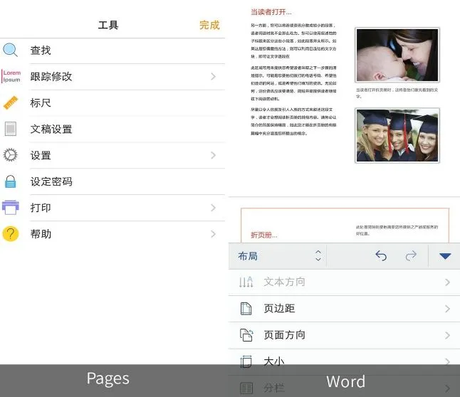 Pages 和 Word 都将编辑功能设置在应用顶部,从文字样式更改页面看,两款 App