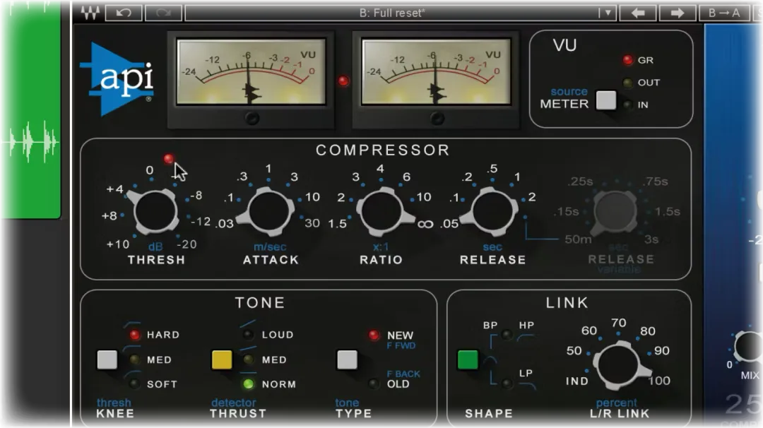 如果你之前用过API 2500,很可能你忽略了它的一些高级控制功能,例如Thrust推力、Knee拐点和Stereo Linking立体声联动。它们都不是可有可无的附加项。事实上,这些功能决定了这款压缩器的响应方式、音色特征以及立体声处理方式。