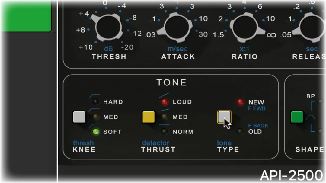 API 2500插件的Tone音色模块主要控制压缩器对信号的响应,特别通过其Knee拐点设置、Thrust推力控制和Type压缩类型(前馈或反馈)来实现。乍一看,你可能会认为API 2500界面中的这一部分类似于均衡器或饱和器——虽然它确实能塑造音色,但却是通过压缩自身特性实现的,而不是直接改变频率。