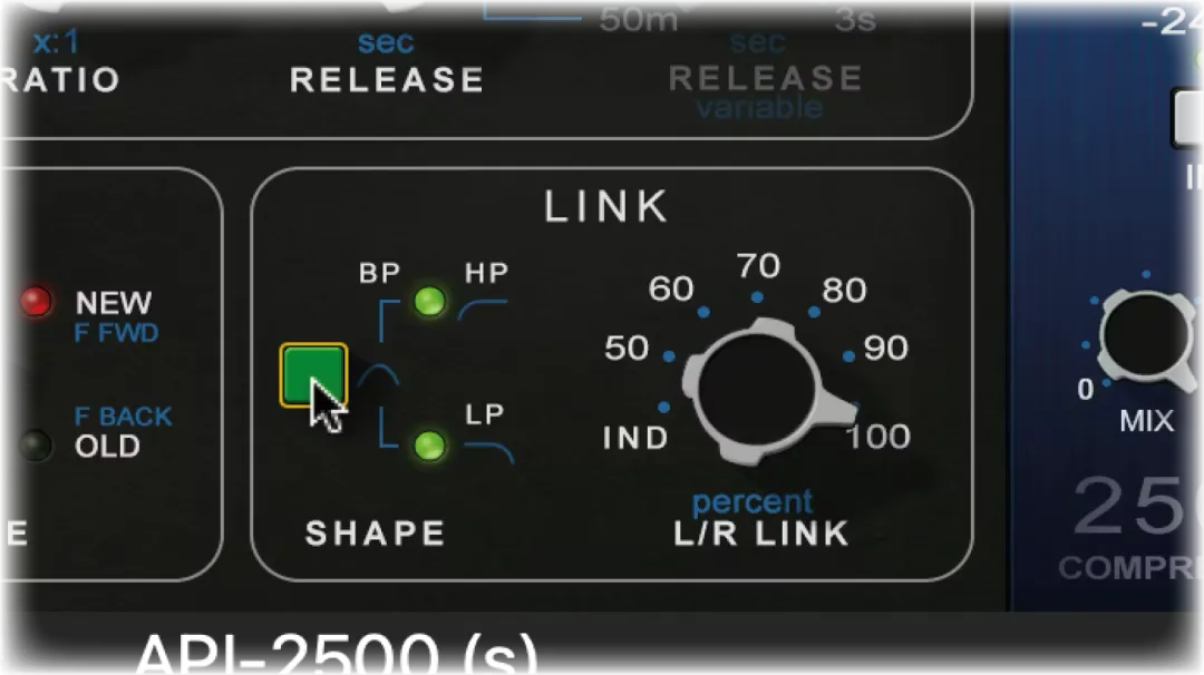 点击绿色的Shape形状按钮,即可在HP、LP或两者兼顾的BP带通滤波器模式之间循环切换,从而控制哪些频率会影响立体声压缩——这非常适合防止偏离中心和稀疏的音源,比如盖过你压缩设置的嗵鼓。