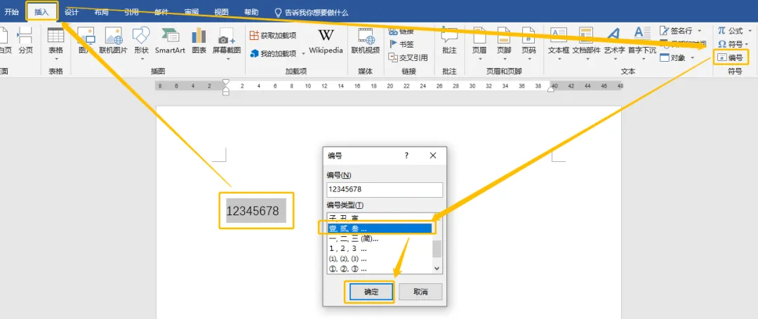 只需先选中需要转换大写的数字,点击“插入”-“编号”,找到“壹、贰、叁…”的编号类型,点击“确定”即可快速完成转化成大写的数字。