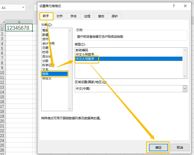 在弹出的“设置单元格格式”窗口,选择“数字”-“特殊”-“中文大写数字”,点击“确定”即可。
