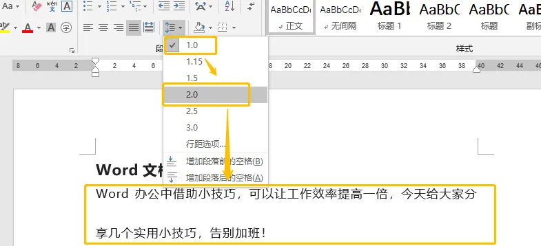 比如下图这种,已经将行间距选择“2.0”了,可是下面的行间距就是没有变化?