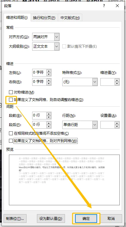在弹出里的段落窗口中,取消勾选“如果定义了文档网格,则对齐到网格”,点击“确定”按钮。