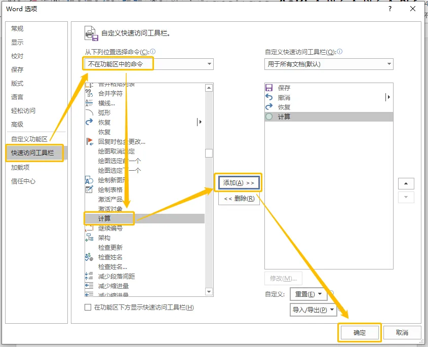 点击“快速访问工具栏”-“不在功能区中的命令”,找到“计算”,点击“添加”,最后点击“确定”。