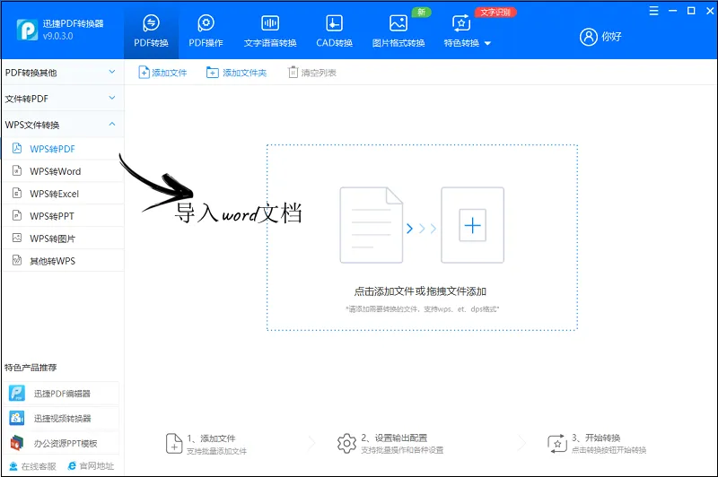 首先进入到迅捷PDF转换器操作首页,然后在pdf转换功能栏下面点击word转pdf功能,接着点击添加文件或者添加文件夹导入word文档。