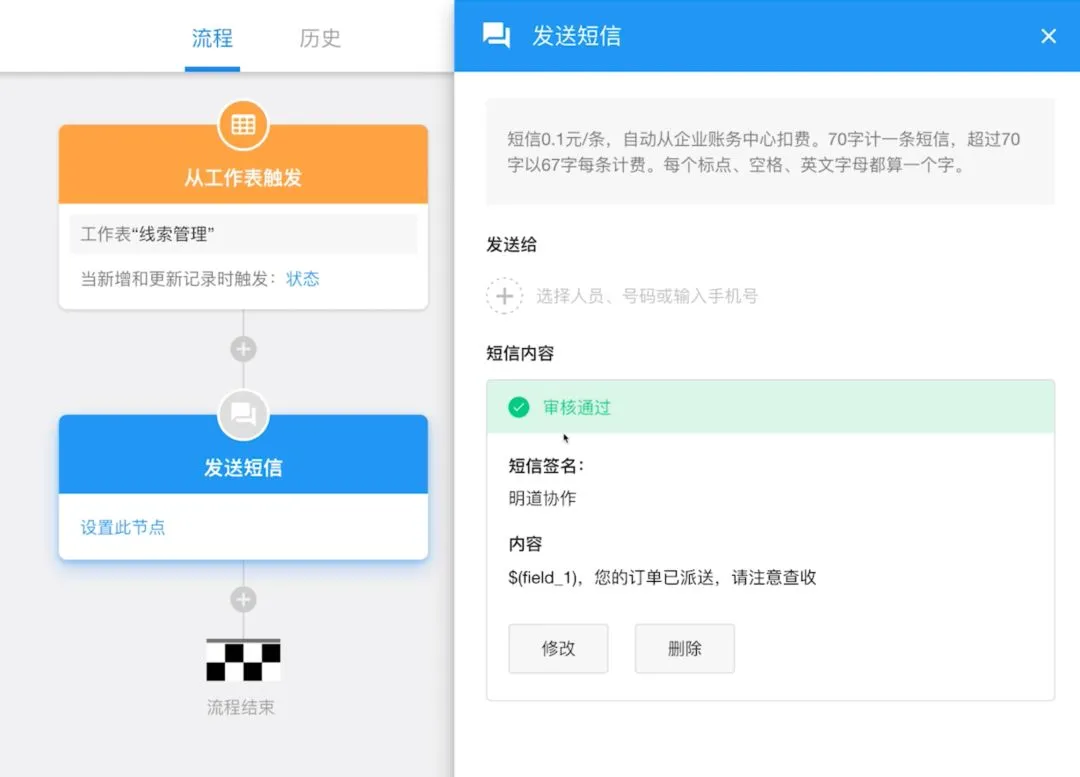 你可以给工作表中的手机号字段,以及明道账号发短信了。想象这样一个场景:当客户下单了,就自动发送一条通知短信,说快递已经在路上。