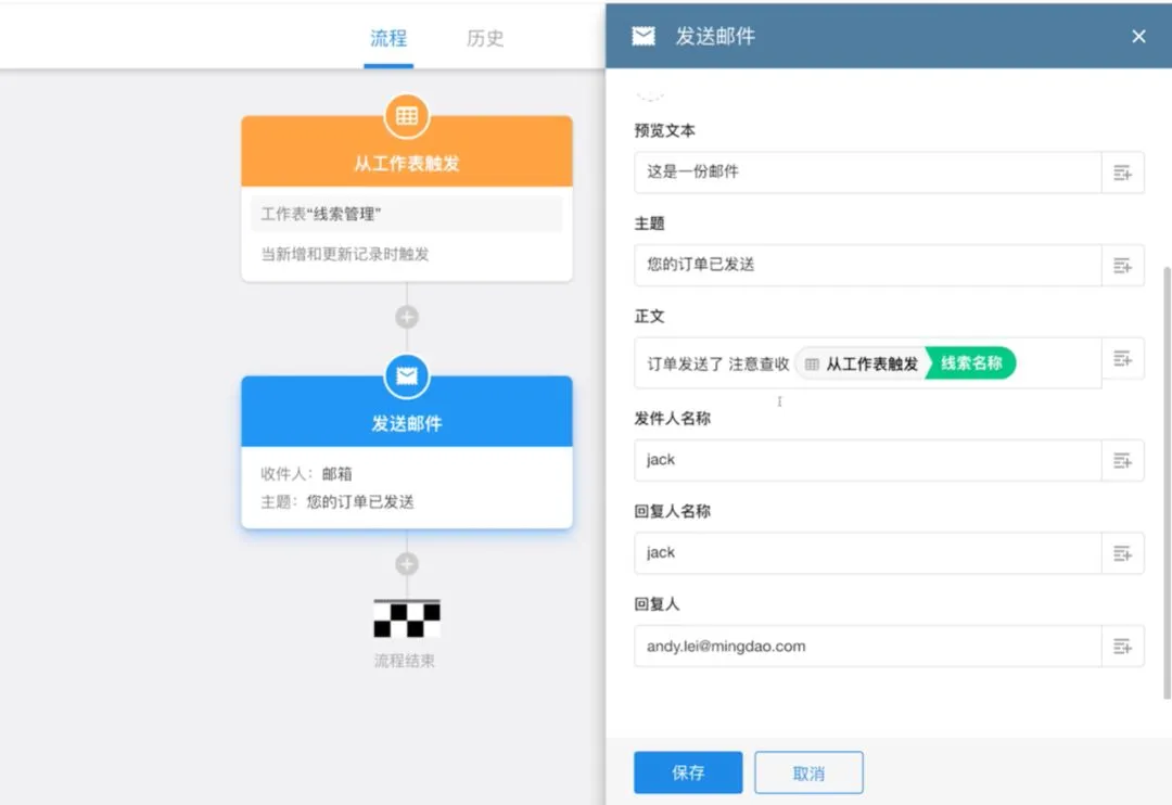 与短信的使用方法一样,你也可以跟客户、跟明道账号自动发送邮件。目前提供的邮件发送域名是明道的,未来可能会开放企业自有域名。
