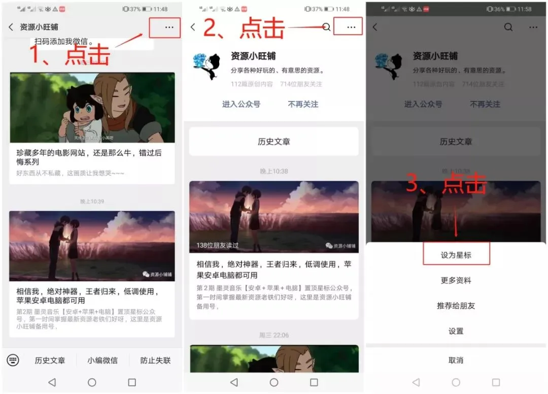 为了第一时间能够看到小铺更新资源的消息,请兄弟们置顶公众号,防止因消息太多而导致看不到小铺发布的文章,兄弟们一定要置顶哦,如何操作看下方三步走图片教程: