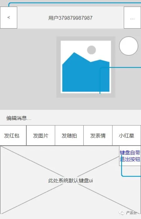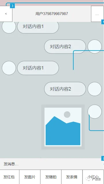 点击发红包,发图片,发表情时,相应的界面从下方弹出,并将原消息界面置灰,完成多媒体素材编辑后或点击置灰的消息界面,均可将聊天输入区复原,并取消消息界面的置灰状态。
