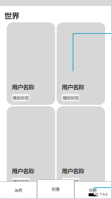 世界随拍其实就是社区/广场,通过这里可以看到其他用户上传到生活视频,采用双行信息流进行排列,最多可以显示4个完整的视频封面,视频封面统一截取视频的第一帧内容,不可修改。封面左下角会显示随拍发布者的id以及系统给定的随拍标签,标签有:人气随拍,附近的人,可能认识的人。