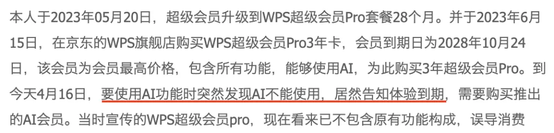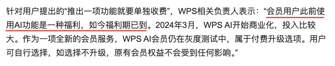 虽然官方在事后回应,说会员之前能用「WPS AI」是因为限时福利。
