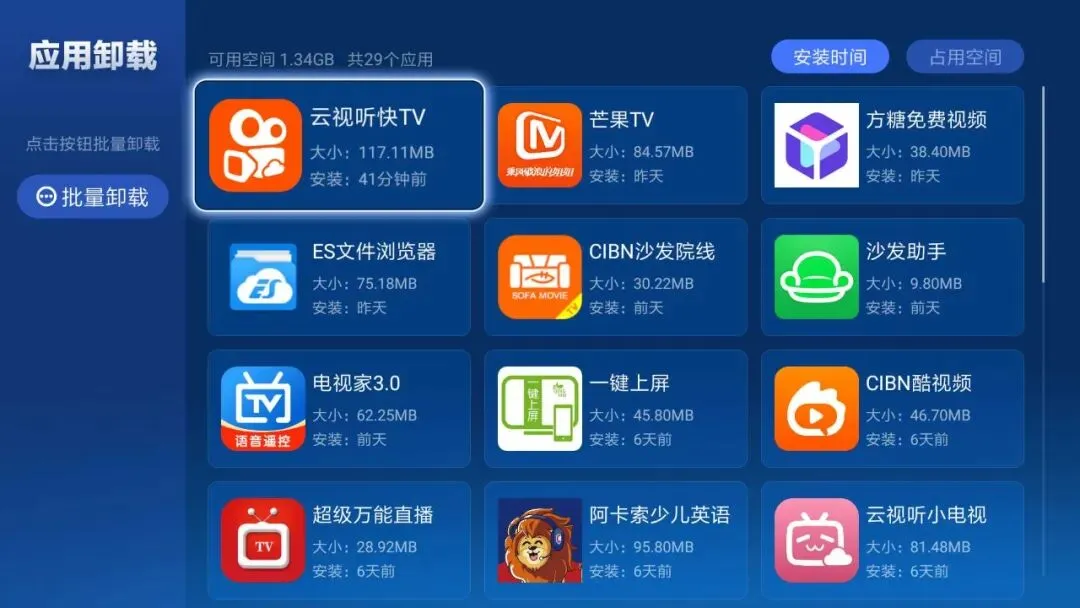有些朋友发现安装的应用没有多少,但就是内存不足。这种情况很可能是你之前下载了许多内容都放置在电视机内存当中,但没有删除,造成内存不足。这个功能可以帮助很多小白用户一键清理掉没有的内存垃圾。