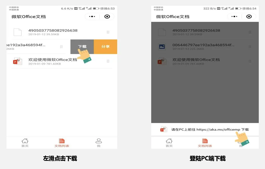 如果你没有OneDrive,小程序也将会为你提供一个临时存储空间与下载网站(登陆:http://aka.ms/officemp,或点击文章下方:原文链接),便于在PC端下载编辑文档。可将网站链接保存在浏览器标签中,方便下次登陆使用。