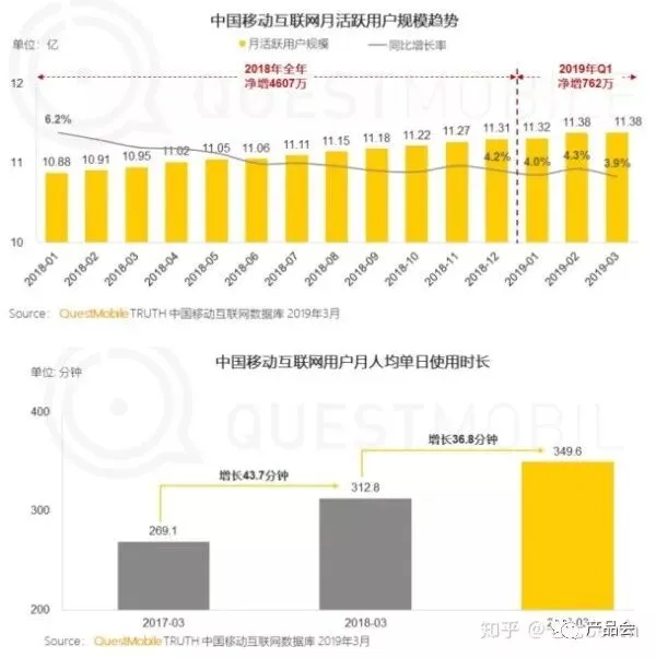 根据《QuestMobile中国移动互联网2019春季大报告》显示,中国移动互联网用户规模增速逐渐减缓,2018年6月已降到5%以下,2019年2月份较去年12月仅增长700万用户。