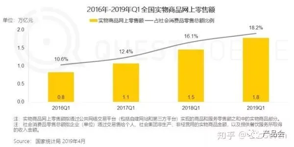 2016年至2019年,实物商品网上零售额及其占全社会消费品零售总额比例均稳步上升。近几年,电商领域除淘宝、京东、当当几家巨头外,涌现了多家社交电商平台如以团购及低价为核心的“拼多多”和以分享生活为核心的“小红书”等。