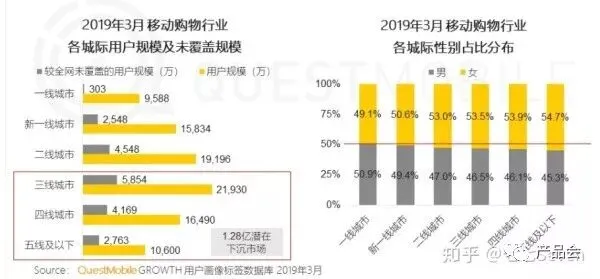 相比一二线城市,三线及以下地区仍存在亿级潜在增量空间,下沉地区女性相比男性占比更高,宜优先拓展。