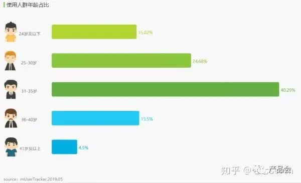 用户年龄:在年龄层分布中,31至35岁的用户占据了40%左右,25岁至30岁的用户占据了25%左右。