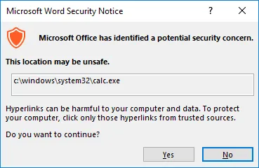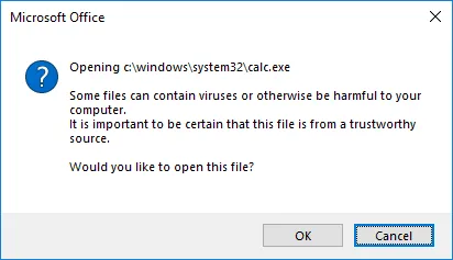 众所周知,人们可能会被欺骗点击Office文档中的“启用编辑/启用目录”。不难想象,用户会单击额外的警告对话框,以往的DDE攻击和最近利用SettingContent-ms文件进行的攻击也演示了这一点。