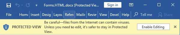 如上所述,文档可能包含Web标记,用于将文件标记为是从Internet下载的。如果是,文档将在受保护的视图中打开。在此模式下,文档中存在的任何嵌入式对象都会被禁用。除非攻击者使用允许绕过受保护视图的漏洞,否则需要额外的社交工程来欺骗用户单击“启用编辑”。