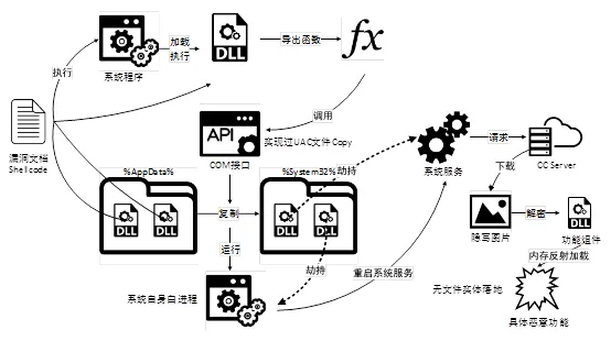 黑客是通过投递内嵌恶意网页的Office文档的形式实施此次APT攻击,中招者打开文档后,所有的漏洞利用代码和恶意荷载都通过远程的服务器加载。攻击的后期利用阶段使用了公开的UAC绕过技术,并利用了文件隐写技术和内存反射加载的方式来避免流量监测和实现无文件落地加载。