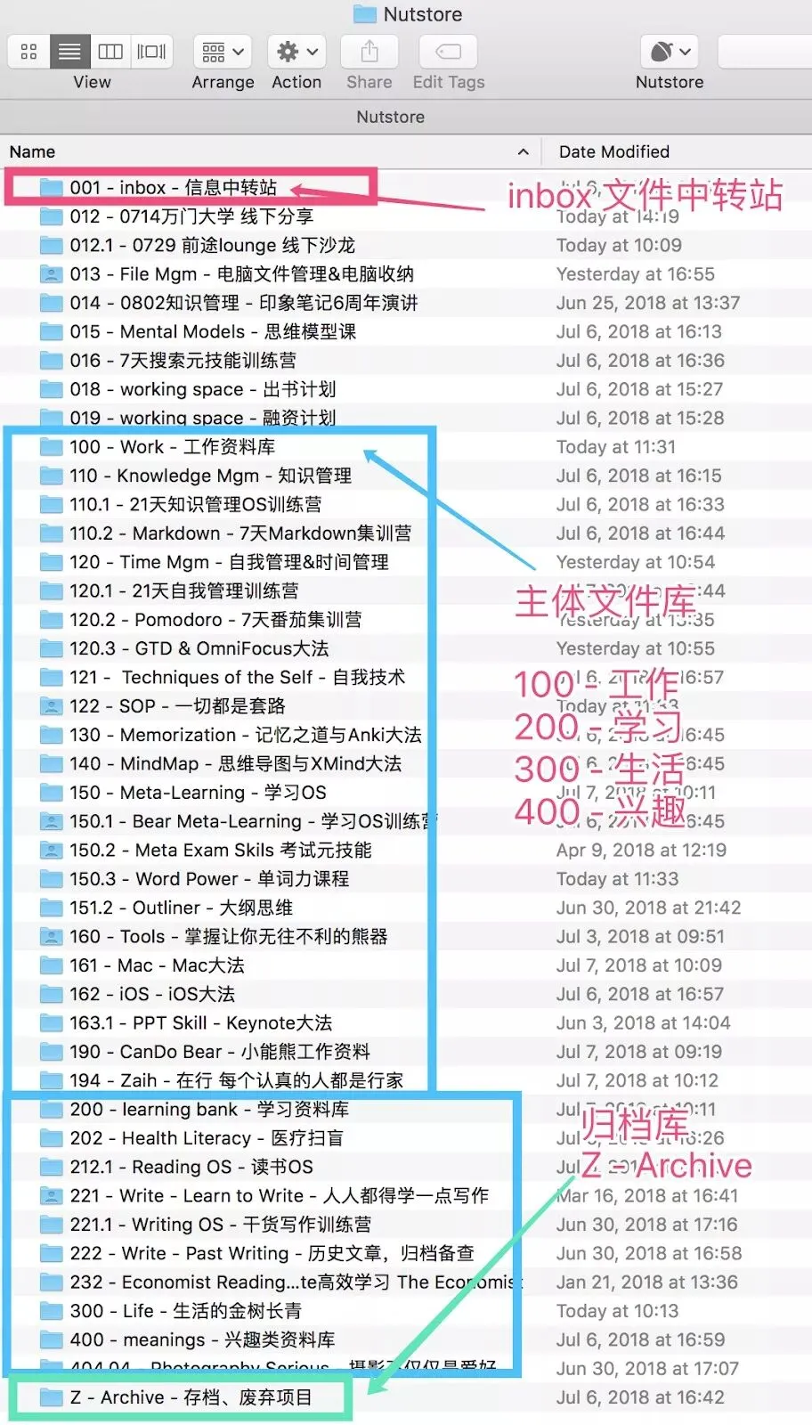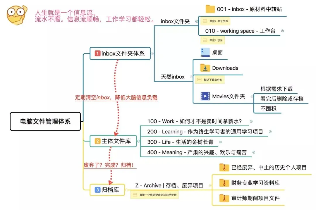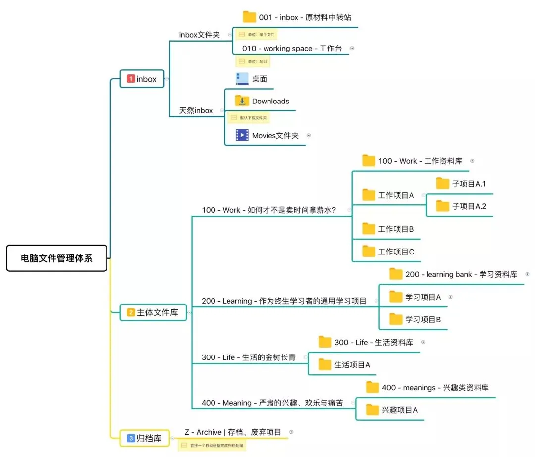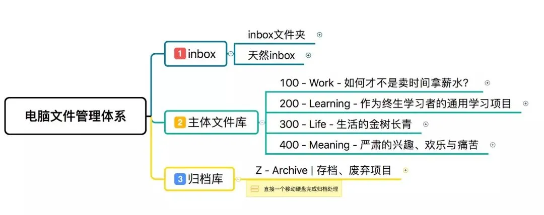 除了按维基百科的唯一分类维度对主体文件库进行分类,我还引入了inbox文件夹和归档库,用GTD流程帮助你完成信息在文件管理系统中的流动。