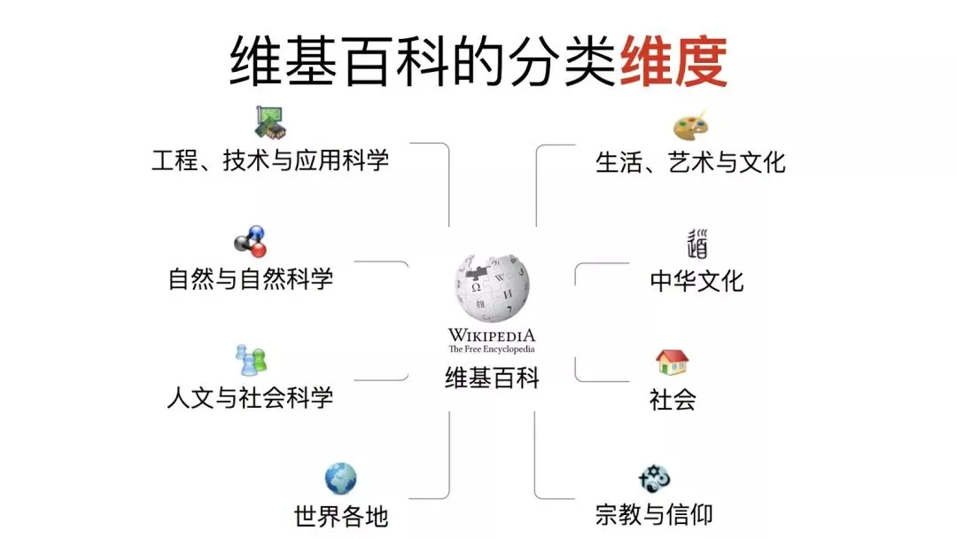 后来,我在调查资料的时候发现,其实像Wikipedia这样一个对全人类知识,对过去几千年的知识进行收集加工整理,建立人类知识库的人类知识管理工程,它也是使用了按性质分类的维度。它基于知识的学科和性质分类,将全人类的知识整理成为一个虽然体量巨大、但是简洁高效的系统。