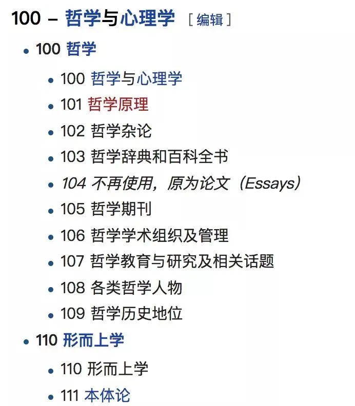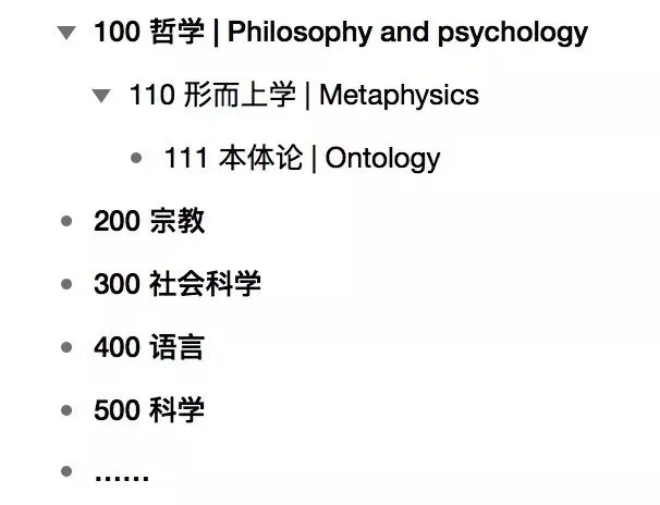 在100哲学这个父类下面,划分为110、120一直到190这些子类,110是形而上学,120是认识论,子类110下面又分成很多孙类,例如111就是本体论,112是方法论,等等等。