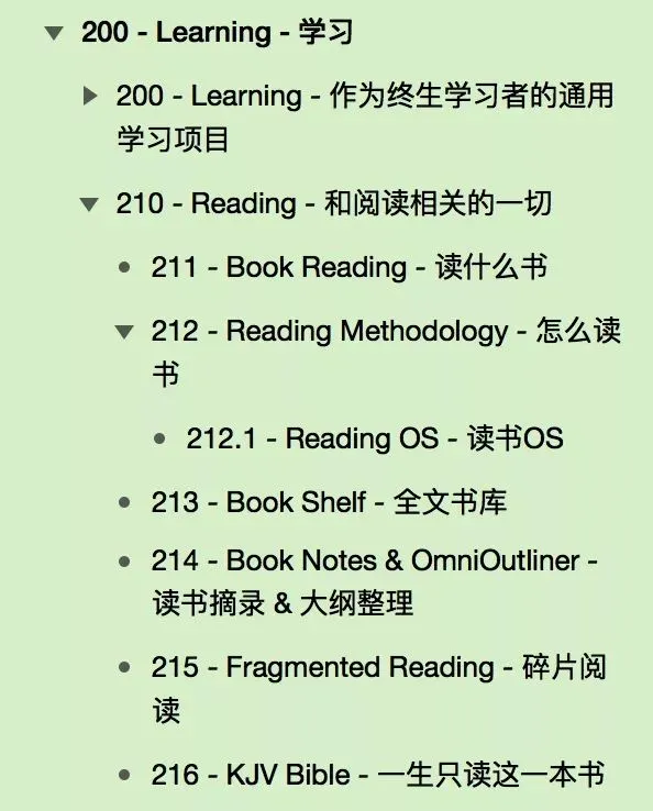 2打头的笔记体系里,210是读书,220是写作,这些都是子类。210读书子类下面,分成211、212……一直到216,这些都是孙类。