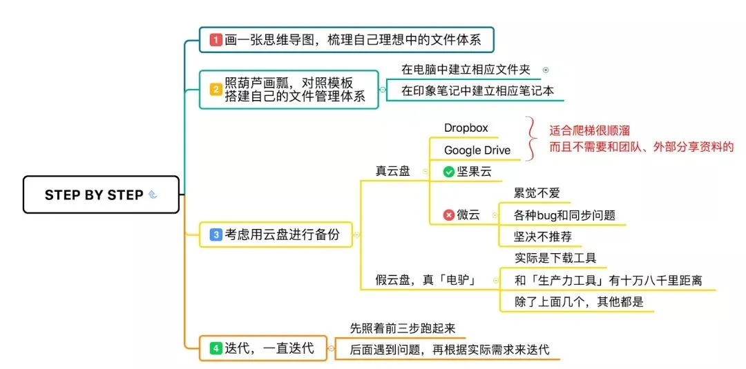 第三步,(根据实践中出现的需求来)迭代。笔记本体系不存在完美状态,而是要适合你当下的需求。迭代笔记本体系,而不要希望一劳永逸,追求完美主义。你在使用过程中遇到的新问题、具体问题,通过迭代进行解决。所以,第一步的导图或大纲,你要保留着,做好版本控制。千万不要靠大脑迭代,那样,努力不可积累。