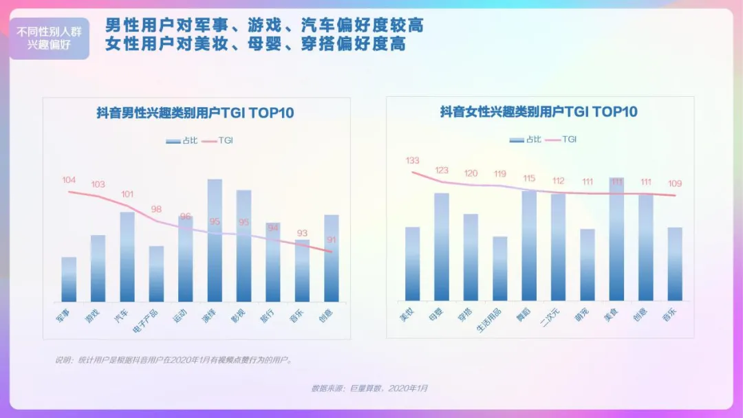 抖音用户偏好视频类型,演绎、生活、美食类视频播放量较高,观看情感、文化、影视类视频增长较快;男性用户对军事、游戏、汽车偏好度较高,女性用户对美妆、母婴、穿搭偏好度高。
