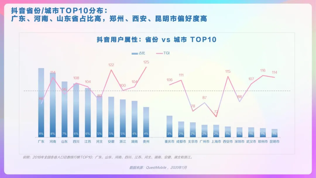 从上图数据可以看出,抖音用户主要集中在华东地区。其中广东、河南、山东的占比最高;全国各市分布情况中,重庆市占比最高。郑州、西安、昆明市偏好度高。