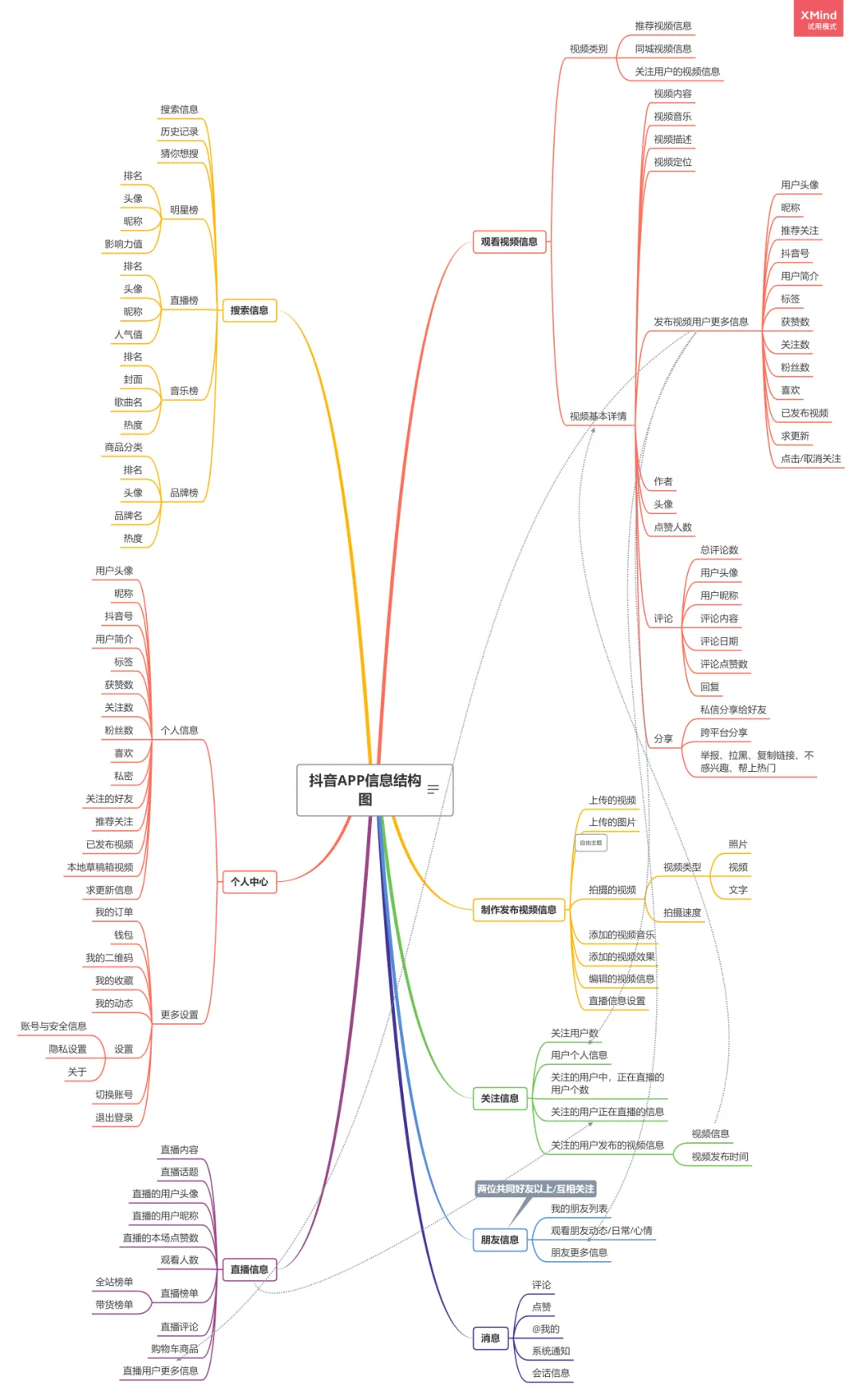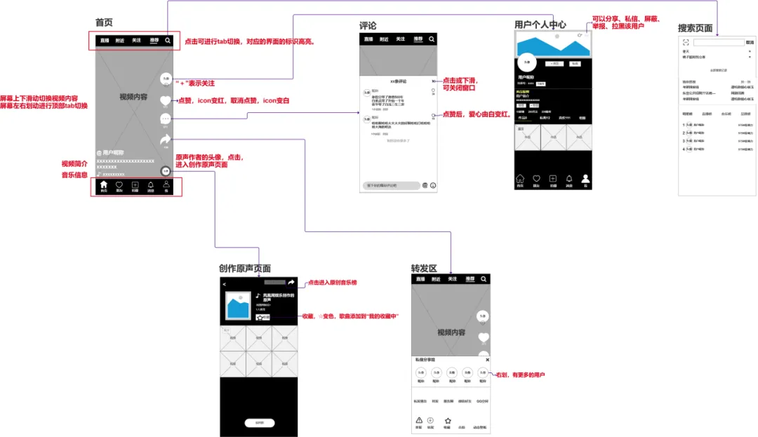 抖音APP作为一个短视频分享平台,它的核心功能是发布视频和浏览视频;由于它的功能点比较多,交互界面比较繁琐,所以我只简单梳理了抖音主要功能的业务流程,页面逻辑以及页面交互说明。