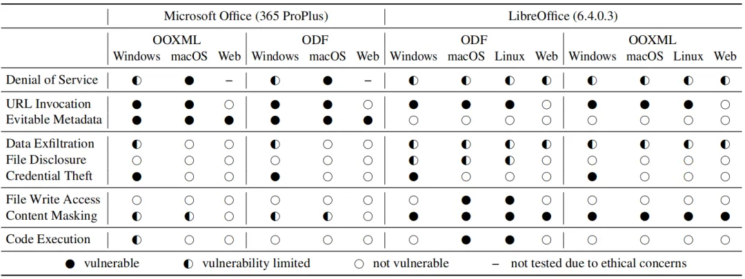 为了评估建议的攻击,针对OOXML和ODF的实际参考实现对它们进行了测试:MSOffice(365 ProPlus)和LibreOffice(6.4.0.3)。两家官方都声称彼此的本机文件格式至少具有部分兼容性。例如,现代版本的MS Word可以打开使用LibreOffice Writer创建的ODF文件。因此,在这两个应用程序中都测试了恶意的OOXML和ODF文档。在所有可用平台(Windows,macOS,Linux6和Web7)上进行了测试,因为结果可能会因某些实现而有所不同。如果办公套件至少在一个平台上易受攻击,会将其分类为易受攻击的。上表中提供了每个测试平台的完整详细信息。所有测试都是使用应用程序的默认设置执行的。可在https://github.com/RUB-NDS/Office-Security 上获得PoC漏洞利用文件,以允许复制。评价结果示于下表。