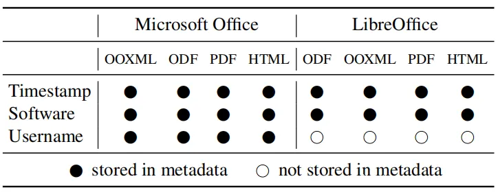 敏感元数据:为了测试现代办公套件存储了多少元数据,在MS Office和LibreOffice中都创建了一个新文档,并将其保存为OOXML和ODFformat。另外,将文档导出为PDF和HTML格式,以查看元数据是否仍保留在导出的文件格式中。评估结果如下表所示。请注意,评估结果对于两个经过测试的Office套件都是一致的,无论文档是否另存为OOXML,ODF,PDF或HTML格式,每种格式都导致相同的元数据。