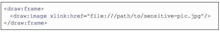 这样一来,文档就可以在磁盘上嵌入任意图像,而无需任何用户交互。而且,使用<draw:object>或<text:section-source> ODFXML标签,可以将任意类型的文件包含到恶意文档中,如下所示。