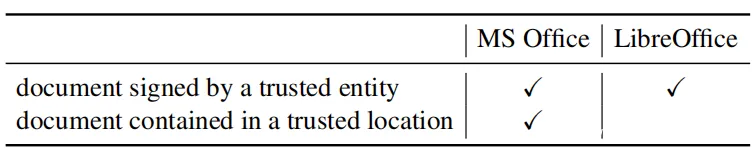 宏:宏的执行默认情况下处于禁用状态,用户必须在MicrosoftOffice和LibreOffice中显式启用它。但是,对于受信任实体签名的文档和具有受信任位置的文档也有一些例外,如下表所示。