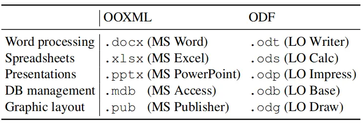 Office Open XML(OOXML)和Office应用程序的开放文档格式(ODF)是办公文档格式的实际标准。每天都有数以百万计的人使用它们:据Microsoft称,MS Office的用户超过12亿,后者将OOXML用作其本机数据格式用于文档,电子表格和演示文稿。根据Document Foundation的介绍,LibreOffice是ODF的参考实现,在全球拥有2亿活跃用户。除此之外,许多公司还大量使用OOXML和ODF文档。没有它们,很难想象标准的办公室任务,例如创建发票和合同、会计电子表格或演示幻灯片。在所有主要平台上以及在云中都可以使用用于处理,创建或导出OOXML和ODF文档的软件。