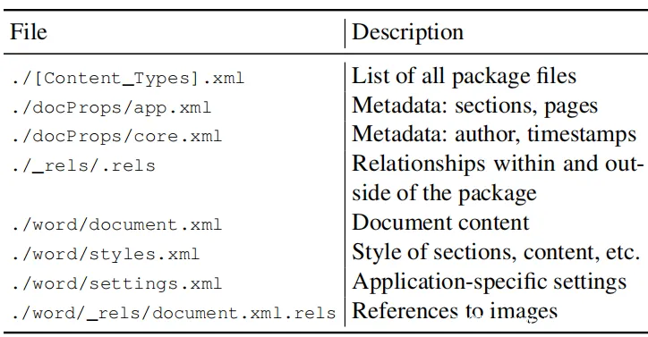 OOXML在2006年主要由Microsoft指定为ECMA-376标准,随后在2016年被采用为ISO / IEC 29500。Microsoft Office从2007年开始使用OOXML,而以前版本的MS Office则以专有数据格式保存文档。在下表中,给出了OOXML zip归档文件中包含的文件的目录列表。OOXML zip归档文件中包含的最重要的文件是document.xml,它描述了实际的内容结构。