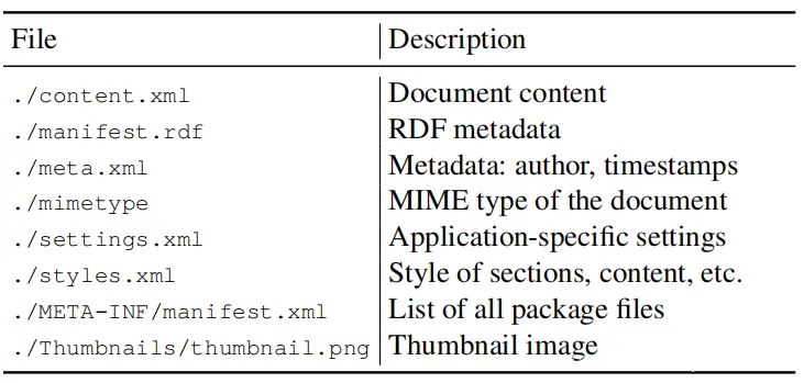 ODF由OASIS开发,然后提交给ISO,并被采纳为标准(ISO / IEC 26300)。当前的稳定版本是2011年的ODF 1.2,而ODF 1.3当前是草稿。与OOXML一样,ODF文档由标准ziparchive中包含的各种XML文件组成。下表给出了目录结构。