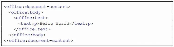 实际的文档内容和文档的内部结构在content.xml中进行了描述。下面中给出了一个用于显示文本“ Hello World”的最小content.xml文件。最著名的ODF实施是LibreOffice,由于有关开源许可问题的争议,LibreOffice在2010年从OpenOffice项目中分叉出来。