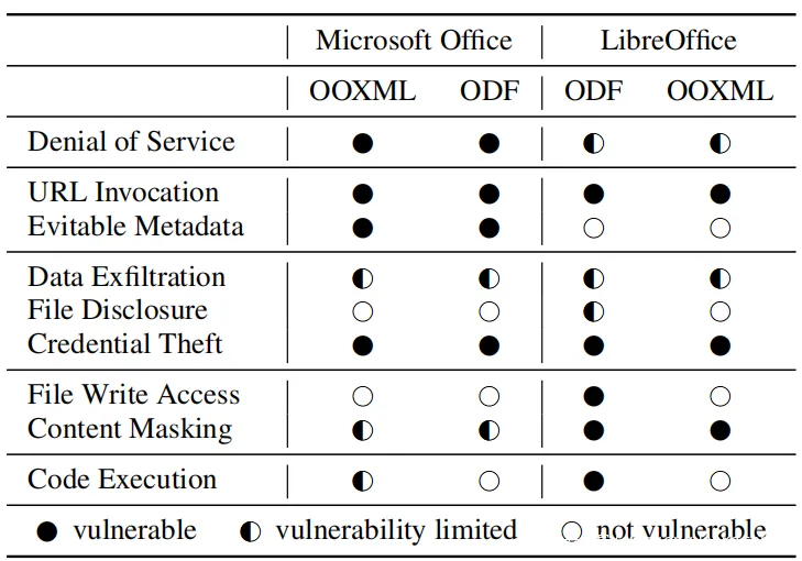 为了评估建议的攻击,针对OOXML和ODF的实际参考实现对它们进行了测试:MSOffice(365 ProPlus)和LibreOffice(6.4.0.3)。两家官方都声称彼此的本机文件格式至少具有部分兼容性。例如,现代版本的MS Word可以打开使用LibreOffice Writer创建的ODF文件。因此,在这两个应用程序中都测试了恶意的OOXML和ODF文档。在所有可用平台(Windows,macOS,Linux6和Web7)上进行了测试,因为结果可能会因某些实现而有所不同。如果办公套件至少在一个平台上易受攻击,会将其分类为易受攻击的。上表中提供了每个测试平台的完整详细信息。所有测试都是使用应用程序的默认设置执行的。可在https://github.com/RUB-NDS/Office-Security 上获得PoC漏洞利用文件,以允许复制。评价结果示于下表。