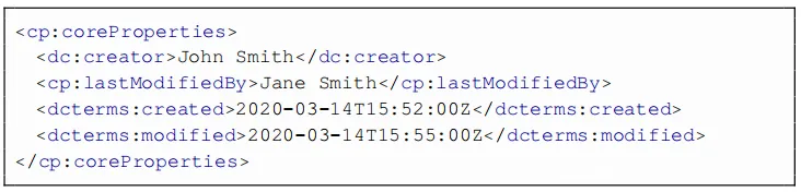 Microsoft Office不仅存储相对无害的信息,例如文档创建的时间戳和用于生成文档的软件,还存储从当前登录用户的名称派生的作者的姓名。姓名,共同作者的用户名和修改日期也添加到元数据中。下面(docProps / core.xml)提供了由MS Office生成的简化的OOXML元数据文件。