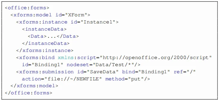 文件写入访问权限:为了测试是否可以将表单数据写入本地文件,使用XForm创建了ODF文档。XForm使用put方法将数据提交到磁盘上的本地文件,该文件由file:// URI方案指定,请参见下面。